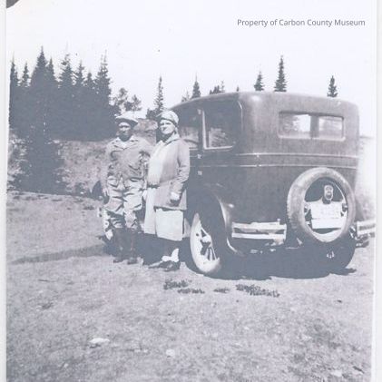 A newly scanned black and white print, 4" x 6," of Joseph and Lena Brooks standing to the left side of a dark colored vintage automobile with unpaved road in the foreground and evergreen trees in the distance. He is wearing dark high top boots with his pants leg tucked in, light color pants, jacket and narrow brimmed hat. She is wearing a light colored long waisted dress, jacket and cloche type hat. They appear to have a very serious expression on their faces. New condition as recently scanned.Collection