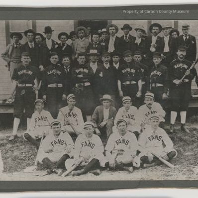 Update 2/2010: Black and white print. Snapshot. Mounted on grey matboard. Image of a group of men posed in rows in front of a raised wood frame building. Two baseball teams in uniforms with a group of men in suits behind them. Seated is a group of 8 players and a coach(?) in a suit. Uniforms are light colored with dark "Fans" across the chest. Standing is a group of 7 players in uniforms with 4 men in suits at center. Uniforms are dark with light "Rawlins" across chest.