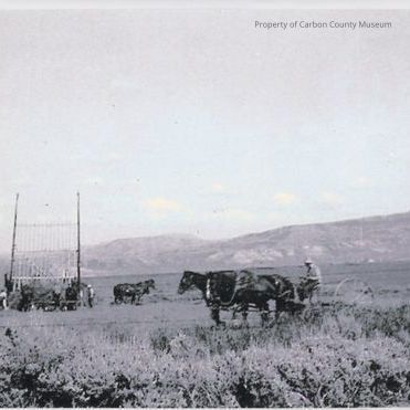 A newly scanned black and white print, 6 1/4" x 11" of a vintage threshing machine on side left of photo and a team of horses hitched and pulling a big wheeled open wagon? Scrub brush vegetation is seen in the foreground. Mesa type mountains are seen in the background. A two strand barb wire fence is seen in foreground in lower half of the photo. Written on back of original, Haying on J. O. Ranch, c. 1933. Original had many imperfections and they are seen in this scan.Collection