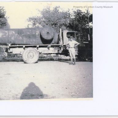 A newly scanned black and white print, 3 3/4" x 6 3/8" of a vintage flatbed truck (seen horizontally) loaded with a long, large cylindrical object. A man with his hands on his hips is standing to the side of the truck cab, dressed in light colored pants of which the legs are tucked into his high top boots, a light shirt, and cap. A dirt road is seen on foreground with trees in background. A dark spot anomoly from original photo is seen on the scan side left. Written on back of original: boiler for Slater rig, 1929.Collection