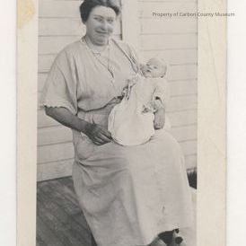 Update 2/2010: Black and white print. Snapshot . Printed on postcard paper. Unused. Written on but not addressed or mailed. Image of a seated woman holding an infant. woman is seated on a chair on a wooden porch in front of a wood frame building. She is dressed in a narrow striped light colored dress. Infant is in a white dress, knitted/crocheted sweater and cap.