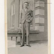 Update 2/2010: Black and white print. Snapshot. Image of a young man standing in front of a brick building with a rounded wall of windows. Young man is wearing a light colored 3 piece suit, white shirt and light tie. He has his left hand in his pants pocket; he wears glasses.