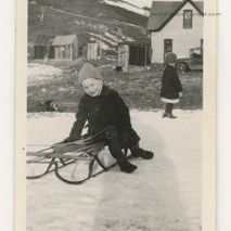 Update: 2/2010: Black and white print. Snapshot. Image of two children playing in the snow. House and outbuildings and hills in background. Small girl in midground has back to camera. Boy sitting on a sled at center is bundled up in dark clothes and a light colored knit hat. Shadow of photographer can be seen on the snow and across boy's left side.