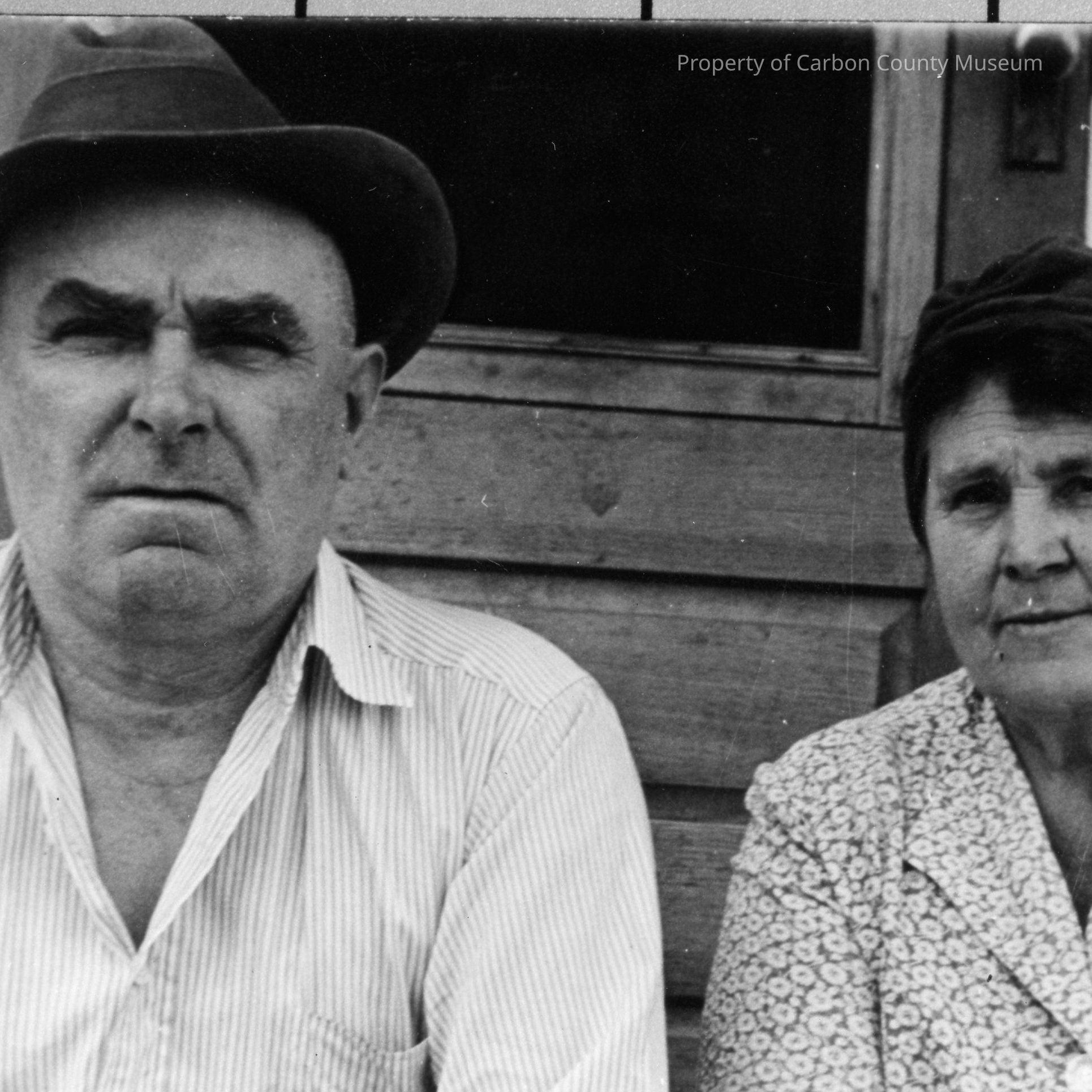 A black and white snapshot reprint of Pete Olsen, Sr., 74, and Fannie Olsen, age 81, in 1956 on the front steps of their home at 416 11th Street, Rawlins. He is wearing a dark narrow brim hat on his head and a fine striped shirt open at the front. She has dark hair and is wearing a turban? on her head, and a print calico type dress. The screen door is seen in the background. Good condition with a double exposure at the upper and side right edge?Collection