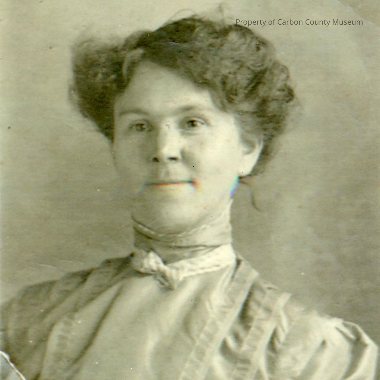 A black and white reprint, 3'" x 3 1/4" of Fannie Olsen, at age 20, 1895. Depicts young woman with dark hair in an updo wearing a high neck dress with pleats in the front and puff upper sleeve showing. Good condition with slight wear and soiling.Collection