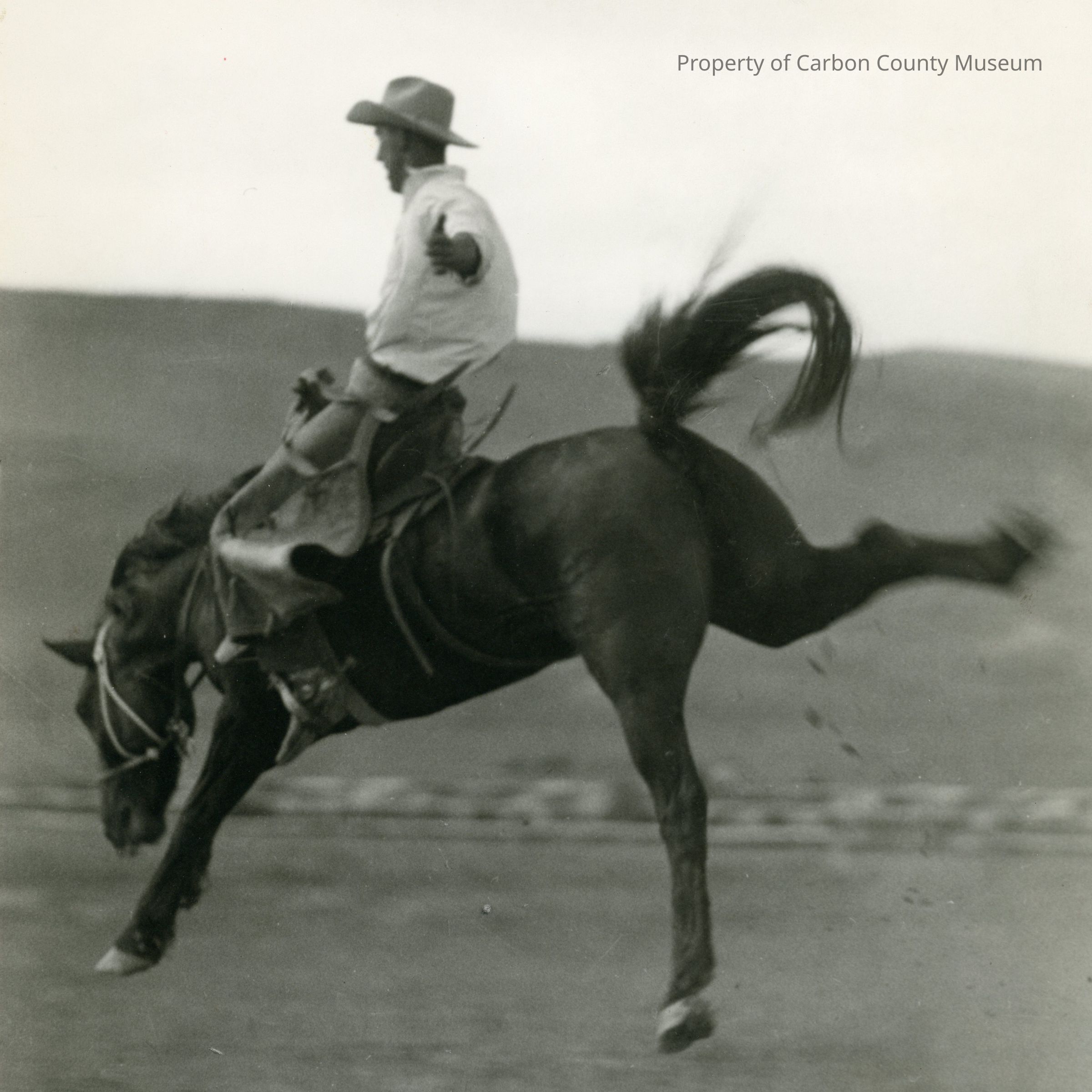 Update 2008: A 7 3/4" x 9 3/4'" black and white photo of Pete Olsen, Jr. riding a bucking saddle bronc. He is wearing a high crown western hat, light shirt, jeans, wide leg chaps. All four of the brown horses legs are in the air. Pete is holding on to reins with his right hand and his left is straight out at his side. Good condition with several negative anomolies at top and bottom including white splotches. Soiling on back and corners. Written on back (1925-1928), taken July 4th, Steamboat Springs, Colorado Rodeo.Collection