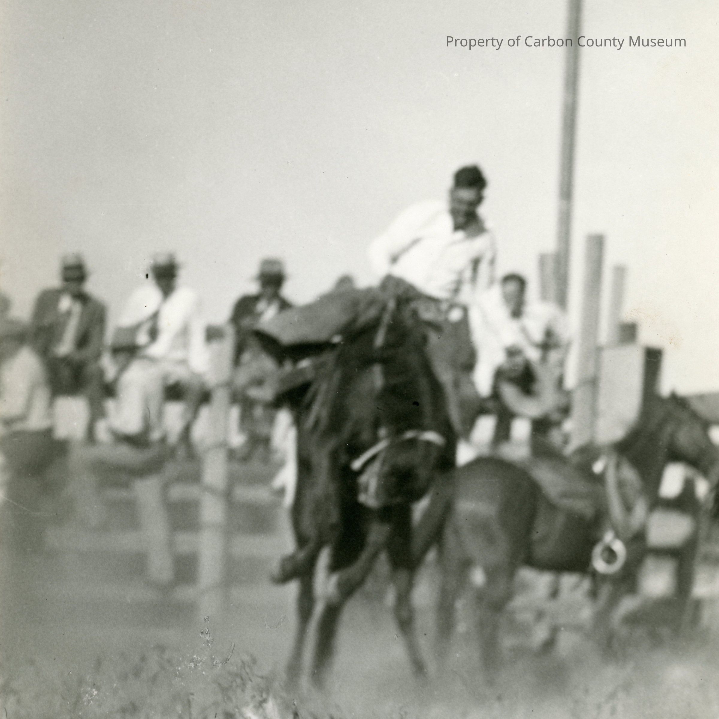 Update: 2008: A black and white photograph, 7 3/4" x 9 3/4" of Pete Olsen, Jr. riding a bucking bronc. The image is blurry, but a fence is seen in the background with spectators seated on the top rails. It is unclear what the horse is doing, but it appears that its front legs are in the air. Pete is wearing a white shirt and has his western hat in his left hand. His chaps are billowing in the air. His right hand is holding the reins. A saddled horse is seen in the background side left. A tall pole is seen in background rising to to top of the photo. Written on the back Pete Olsen, Jr., 1929.