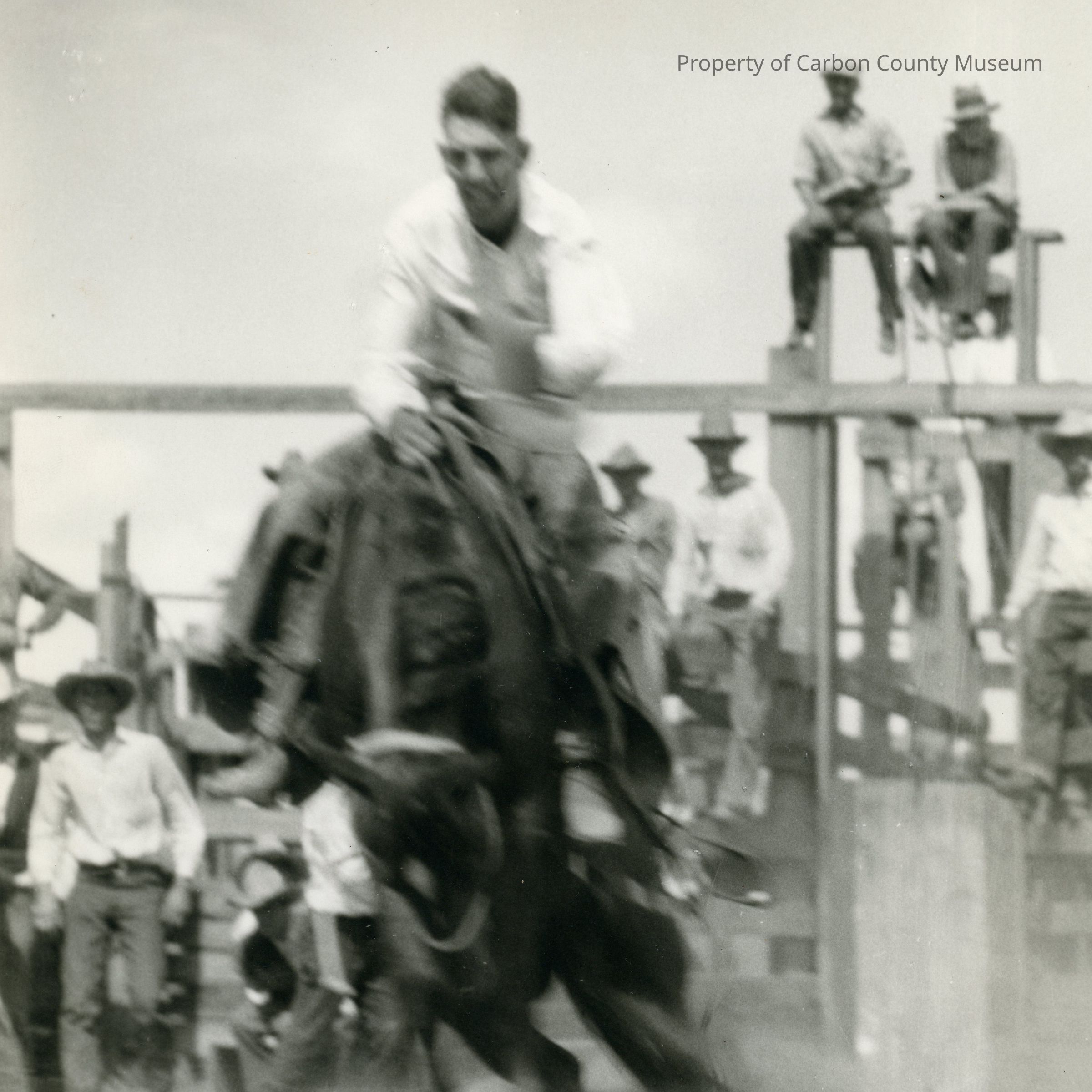 A black and white photograph, 7 3/4" x 9 3/4" of Pete Olsen, Jr. riding a bucking bronc. The image is blurry, but a fence is seen in the background with cowboys seated on the top rails and standing in the rodeo arena. The bronc is bucking and Pete is holding on to the rein with his right hand and his left arm is held to his front side. He is wearing a white shirt, jeans and chaps. The lower half of the photo is blurry. Written on the back, Pete Olsen, Jr. , 1929.
