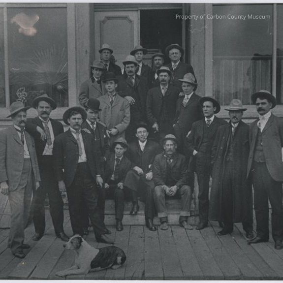 A black and white scanned copy of a large group of men, ca. 1896, dressed in suits, ties, and all wearing hats of various styles, with a few men with long overcoats over their suits standing and sitting (front row center) in the entryway of a two door building. Door on photo left is shut and door on photo right is open to inside of building . A two toned dog (white on upper torso and dark on rear half) is lying on a wooden side walk in front of the group of men. The dog's head is in an upright position with it forelegs stretched out in front. Glass windows are on side left with tropical looking plants seen behind the glass. Side right has matching glass windows with cafe curtains (multi-toned striped) seen hanging on a small curtain rod across the interior window. There is a wooden feature on the photo left side which slants upward from the wooden sidewalk (storm cellar doors?) to the lower edge of the building. Many of the men have upper lip mustaches and several are smoking. Man in first row, side right has a newspaper in his outside jacket pocket. This group photo had been believed to contain Butch Cassidy, Sundance Kid, and the Wild Bunch, but is now subject to much question and may be nothing more than the Elks Club members. Note: Jack Stroud who has studied and compared other photos believes this to be Elks Club Members, see photo 2008.848.8.1. Measure 8" x 10." Copy is in fair condition with unknown stains on surface, soiling on top and back of photo, blemishes from processing? worn edges, and slight crinkling at top and sides. This photograph is identified with different names on 2008.848.8.1.Collection