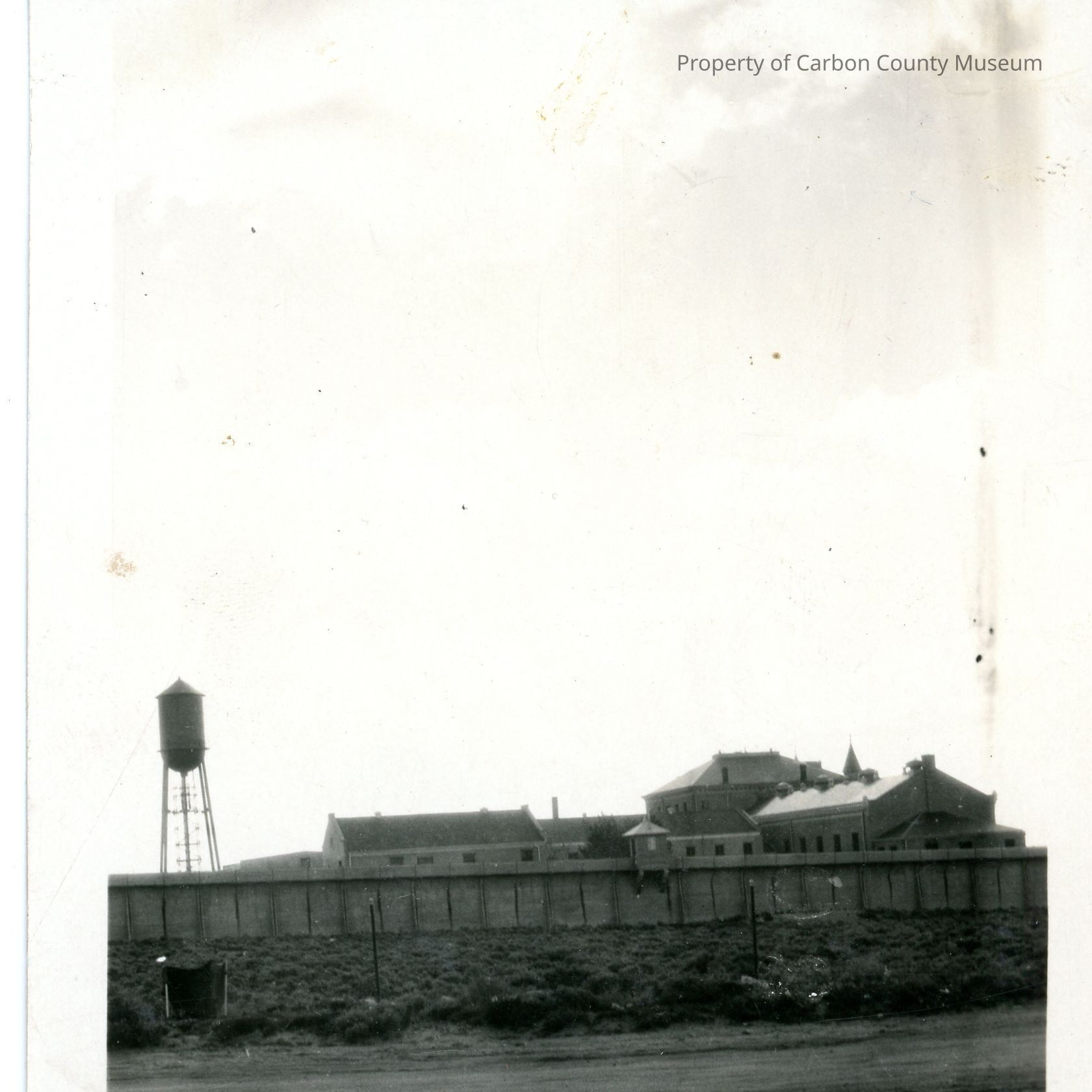 Black and white photograph. A large building complex with a water tower surrounded by a high wall. Written along the top of the photograph is "THE PENITENTIARY". On the reverse the following is written: