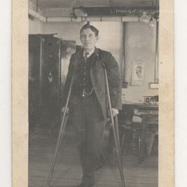 Unidentified man posing on crutches. He has only one foot. Lockers and desks behind him.