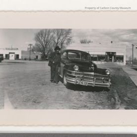Update 2/2010: Two black and white prints. Snapshot. Image of a man dressed in dark overalls and coat standing beside vintage 1930s or 40s automobile with Wyoming license plate "6 130" from 1949. Automobile parked on dirt street or lot with buildings in background. Scalloped edge.