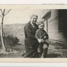 Update 2/2010: Black and white print. Snapshot. Image of a woman and a small boy posed in the yard of a frame house, vegetation and hill in background. Woman is wearing a dark dress and is down on one knee behind boy. Her hair is pinned up and she is wearing glasses. Boy is dressed in dark sailor suit.