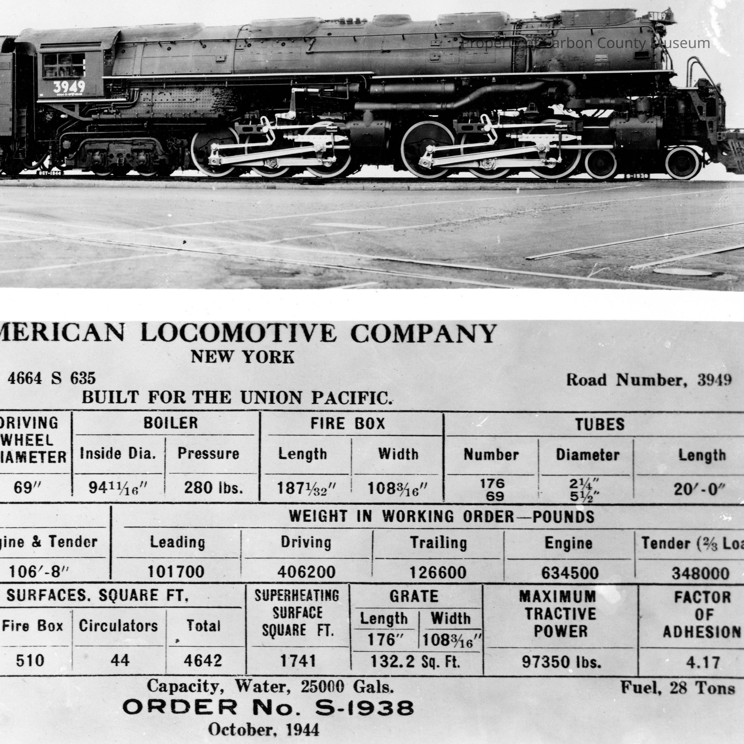 A 8 1/2" x 10 3/8" black and white print of a Union Pacific Locomotive #3949 Class 4 cylinder simple built for Union Pacific by American Locomotive Company, N. Y. Sales order # S-1938, October, 1944 with tender car. Union Pacific is painted on tender car in white lettering. The linear photo of train is seen at top half of print. Lower half of print has the title American Locomotive Company, N. Y. with detailed specifics printed in chart form, includes gauge of track, fire box, bylinders, boilers, etc.Collection
