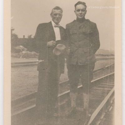 Update 2/2010: Black and white print. Snapshot. Image of two men standing in a rail yard. buildings and trees in background left .Man on left is wearing a dark suit and bow tie and is holding the young man's hat in both hands in front of him. Young man at right is dressed in a military uniform and is standing with his hands behind his back.