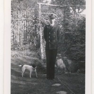 A black and white print of an unknown man dressed in a navy uniform, standing outside by a wooden trellis, with a terrier dog to his right foot. a sprinkler hose is on the right side of the photo on the ground. The number 45 is stamped on the backside of the print.Collection