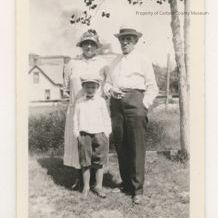 Update - January 2010: Black & white print. Snapshot. Image of a man, woman & young boy standing in a yard that has irregular grass. Fence, scrubs & tree in midground; buildings & trees in background. Man is dressed in dark pants, white shirt &hat & is holding a cigar. Woman is wearing a white dress & hat. Boy is dressed in dark knickers, white shirt; bow tie, long stockings, lace-up shoes & light cap; his hands are in his pants pockets.