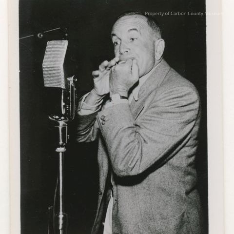 Black and white photo of a man standing in front of a microphone with his hand in his mouth, a wrist watch on his left arm, a textured suit, jacket open, with a light shirt.