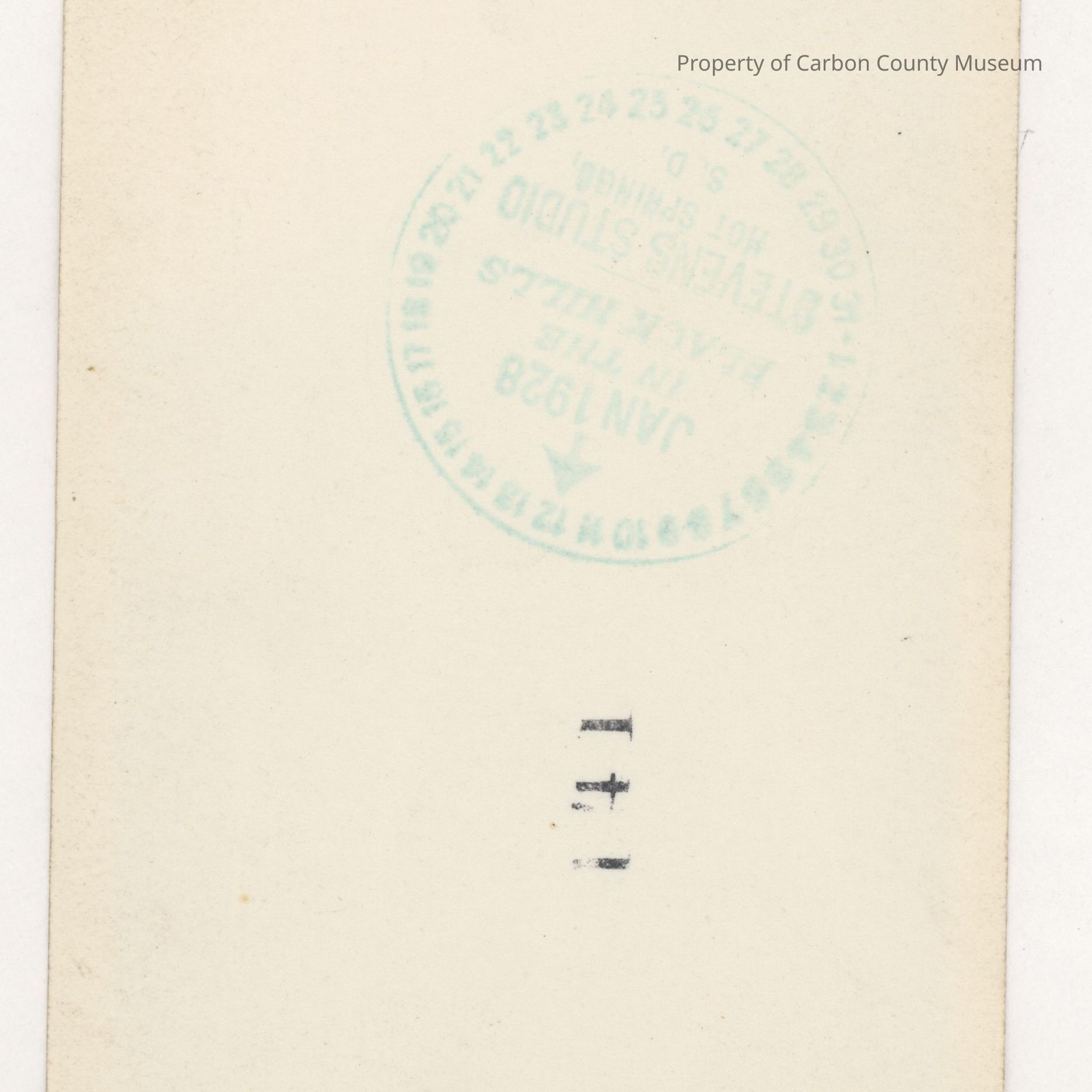 Stamped on back in green ink: "[circle with numbers around edge] [arrow pointing to "12"] Jan 1928 In the Black Hills Stevens Studio Hot Springs, S.D.".