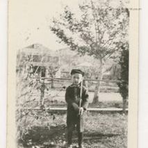 Update - January 2010: Black & white print. Snapshot. Image of a young boy wearing dark knickers, long socks, dark jacket & cap; standing in a grassy yard; he is holding a stick over his left shoulder. Fence, trees, road, buildings & hill in background.