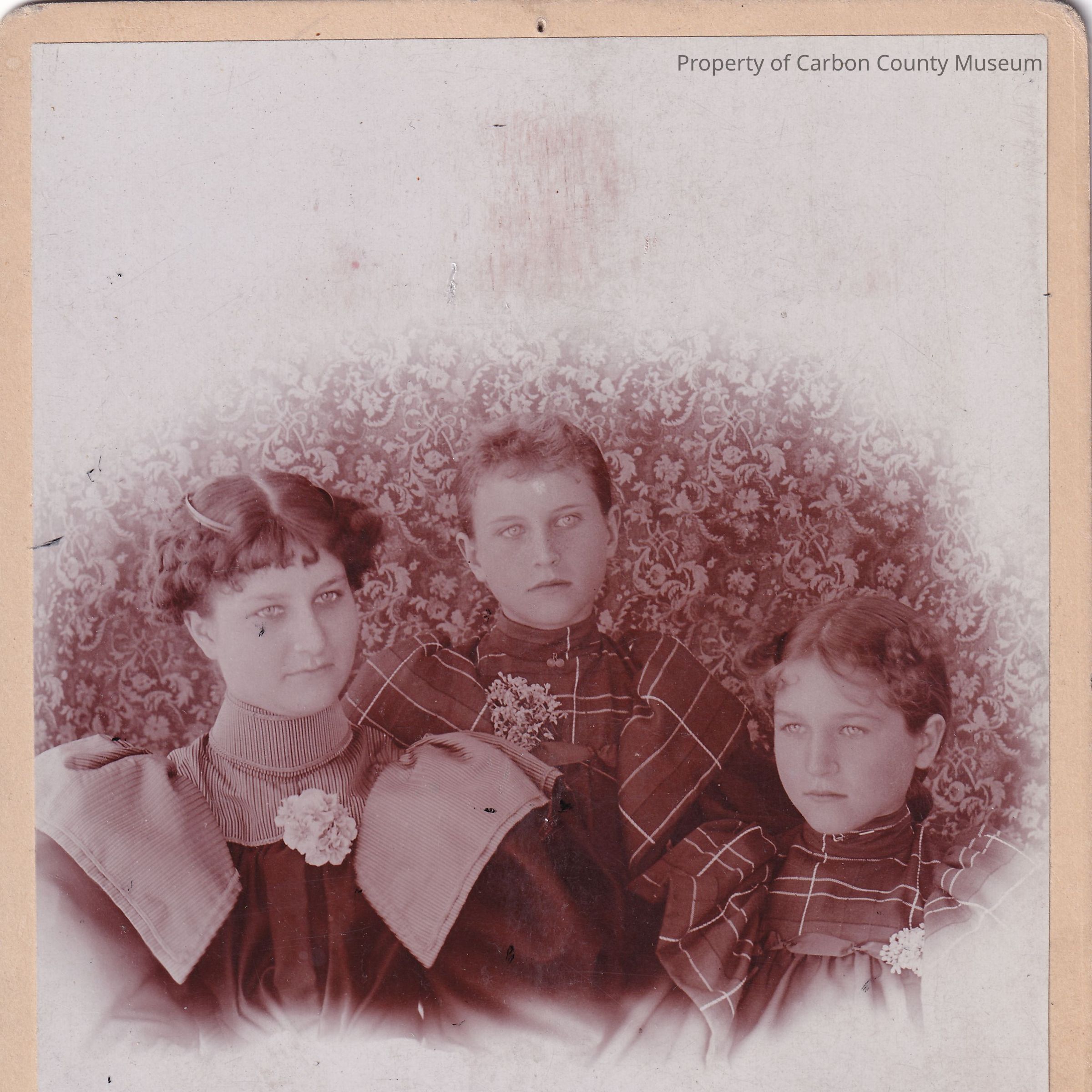 A cabinet card photograph of a woman and two girls - possibly a mother and her daughters - wearing formal clothes in front of a floral background.