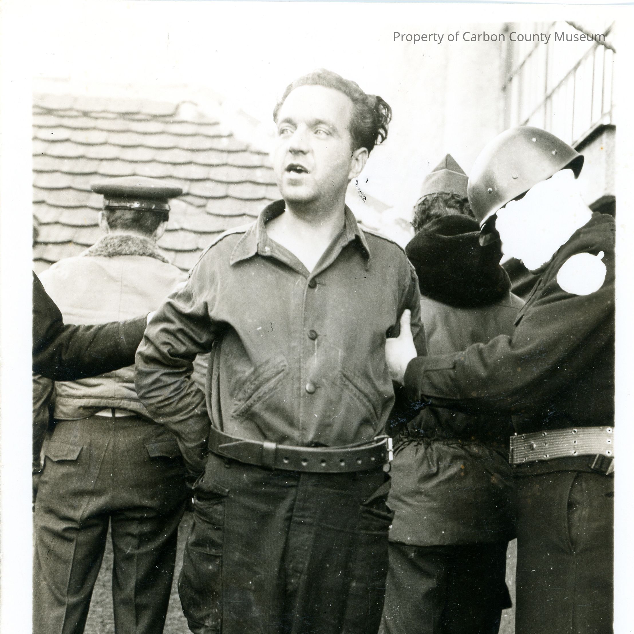 Black and white photograph of a man wearing a prisoner uniform. The man is held in place by a man wearing a military uniform, his face has been scratched out. A third man out of frame is also holding the prisoner in place. Behind the three are two men in military uniform with their backs to the camera. On the back of the photograph is printed "Peroutka, Alex EXEC WCPL 12 Nov 48".