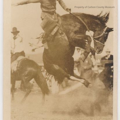Update 2009: Black and white print. Printed on postcard paper. Image of a cowboy on a bucking horse. Mounted man in background left, spectators in background at right.