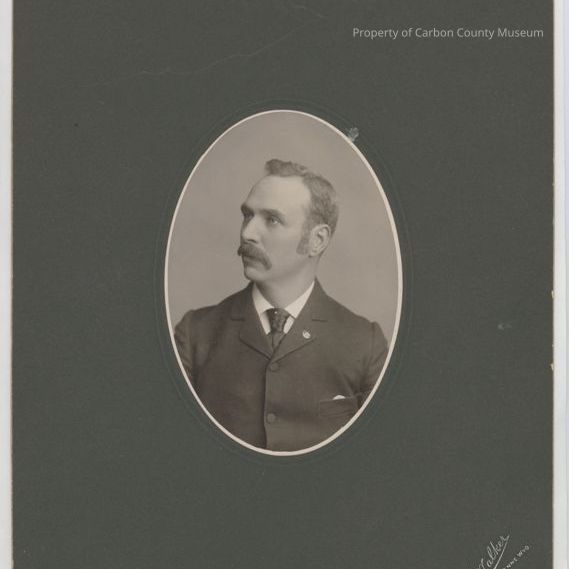 Update 2009: Black and white studio portrait, oval print attached to black mat with beveled edges. Etching lower right corner: W.G. Walker, Cheyenne, Wyo. Print is of a man profile left wearing a dark suit jacket with high narrow lapels. His white shirt and dark tie shows through. His hair is short, medium colored with ear lobe length side burns. he has a mustache which curves slightly downward. A small lapel pin is on jacket left at first notch.