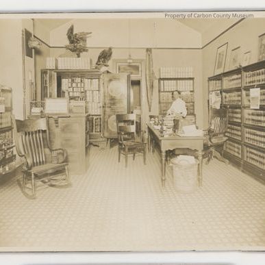 Update - 2009: Sepia print. Mounted on grey matboard. Image of the interior of an office. Along left wall is a typewriter, bookshelf of books, rocking chair, short counter with wire edging & a large open safe. Mounted wolf/coyote head & eagles (?) in back left corner. Along right wall are more bookcases. Right side of back wall also has bookcase & pelt. Long table, chairs, wastebasket in center of room. Gertrude Huntington Merrell standing behind table.