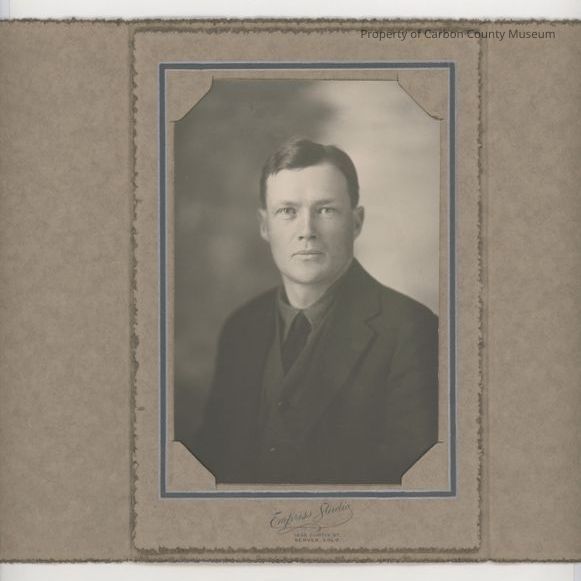 Update 2009: Black and white print. Studio portrait. Mounted in two-fold light brown with darker edges mat folder. Grey and silver "frame" around photo. Half length portrait of a man in a dark suit, dark vest, dark tie, and dark shirt. He is clean shaven and has short dark hair.