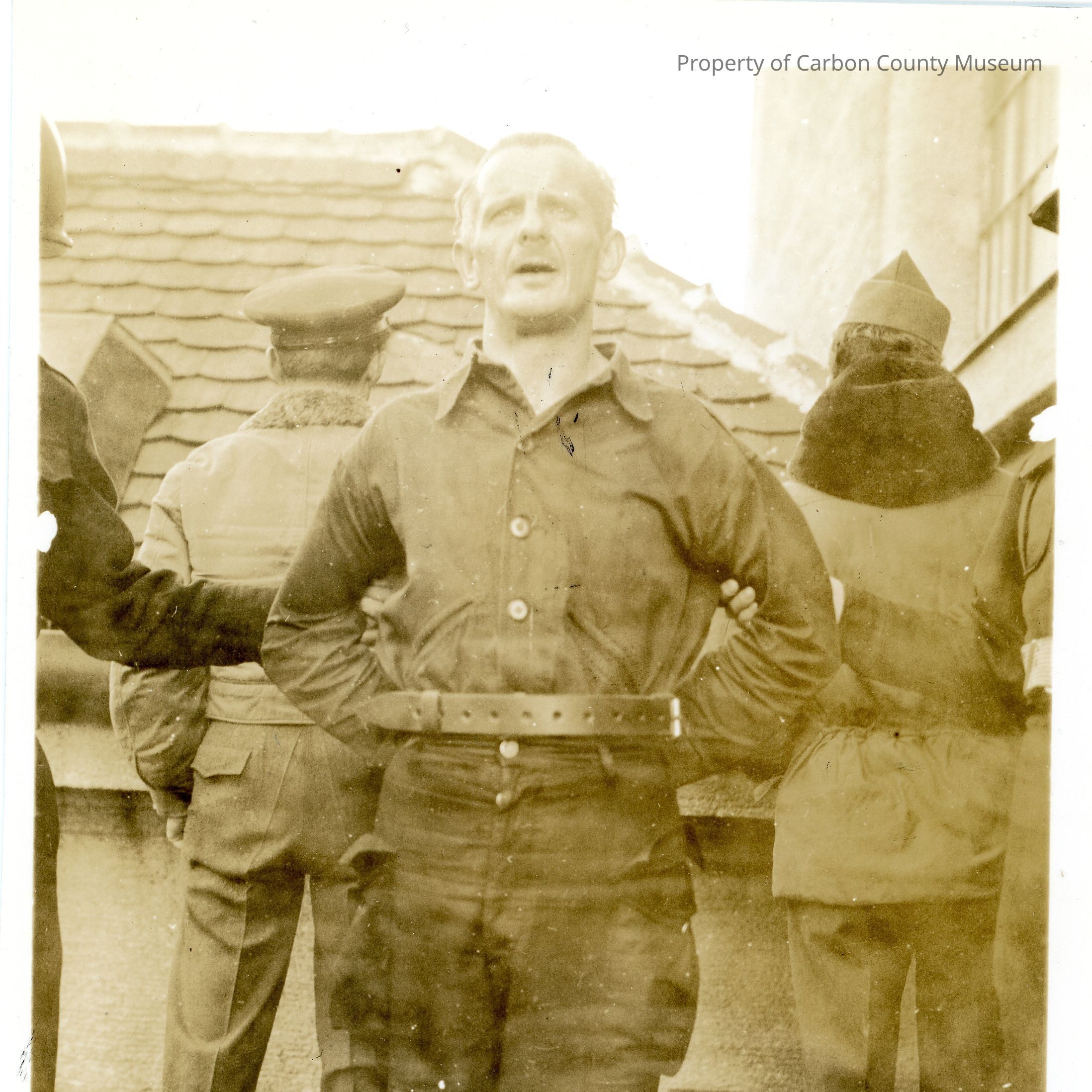A sepia tone photograph of a man wearing a prisoner uniform, he is being held in place by two men who are out of frame. Behind the three are two men in military uniforms with their backs to the camera. On the back of the photograph is printed "Sielaff, Hans EXEC WCPL 12 NOV 48".