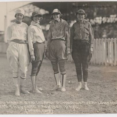 Written on original negative at bottom: "Bonnie Grey Mable Strickland Donna Glover Lorena Trickey Relay riders Cheyenne Frontier Days (Doubleday)".