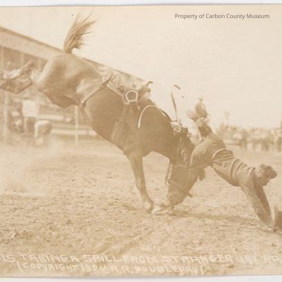 Update 2009: Black and white print. Printed on postcard paper. Image of a cowboy being thrown from a bucking horse in an arena. Grandstand and spectators in background.