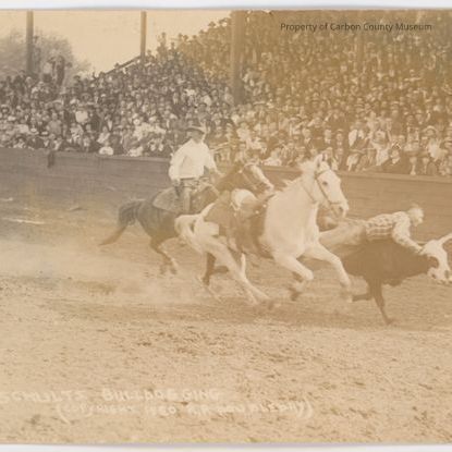 Written on original negative at bottom: "Guy Schultz bulldogging (copyrighted 1920 R.R. Doubleday)."