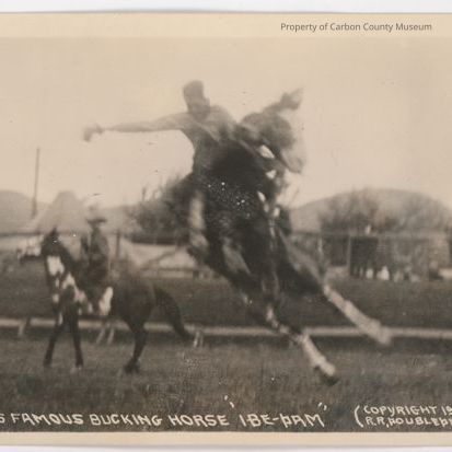 Written on original negative at bottom: "Irwins Famous Bucking Horse" "I-Be-Dam" (Copyright 1923 R. R. Doubleday).