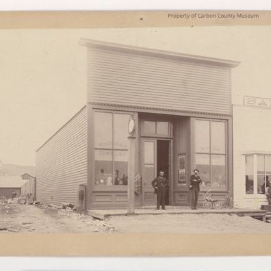 Update 2009: Black and white print mounted on a tan mat. Image of store with two men on boardwalk in front. Painted in windows: "Watches Jewelry" "Books Stationery". Clocks can be seen through the window. Post by walk with clock on top. Buggy and tricycle also on walk. Open lot to photo left with two young boys, other buildings in background. Business to photo right is bakery .Two people stand on walk in front of bakery. Written on back in blue ink: "Early day buildings on Front Street around 1895". "Photograph taken 1884-1885 not 1895. Lot 16, block 23, 400 block N. Front St. } DK RB". Written in pencil: "Lovey Weith's watches and Jewelry. Wm. J. Smith Bakery." "11/1883 E. H. Smock built building. 2-84 Lovey Weith purchased building to 12-85 for Jewelry store. 10/1887 Hub Saloon. 11-1888 to 3/1889 M.W. Dillon Rented Hub." Written in black " Copied by State Mounted". In pencil at bottom "8 Page 28 pix 3 2 1/4 x 3 1/2". In blue ink: "L.J. Nelson." Condition good. Holes punches in mat top. Liquid stain, scratches, rubbed.