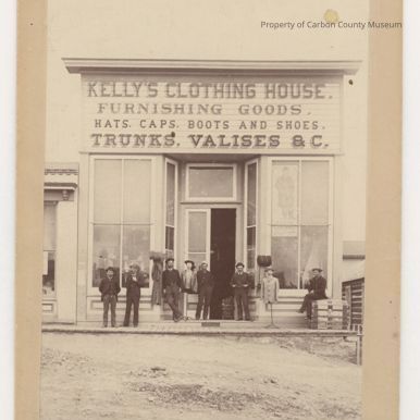 Update - 2009: Black & white print. Snapshot. Mounted on tan matboard. Image of a storefront with a group of 6 men & 2 half mannequins posed on boardwalk in front. Sign on building: "Kelly's Clothing House. Furnishing Goods, Hats, Caps, Boots and Shoes. Trunks, Valises, & C." Dirt street in foreground.