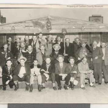 Update 1/2008: Black and white print. Image of a group of men posed in front of a wood building and wood fence. 26 men in various outfits from casual to suits and boots to dress shoes. One man is holding up a shovel.