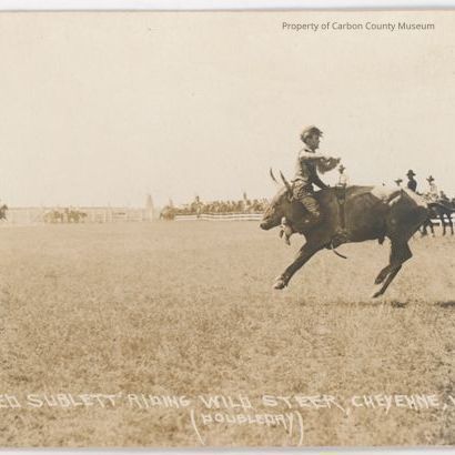 Written on original negative at bottom: "Red Sublett" Riding wild steer, Cheyenne, Wyo. (Doubleday".