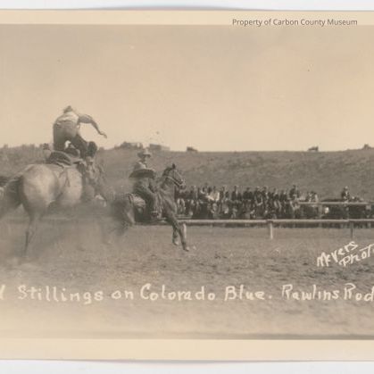 Written on original negative at bottom: "Floyd Stillings on Colorado Blue. Rawlins Rodeo "24" "Meyers Photo".