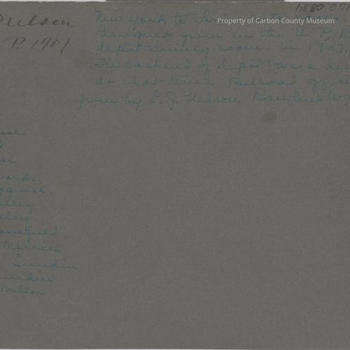 Written on back in blue ink: "New York to Paris Auto Races-Banquet given in the U.P. Railroad Depot dining room in 1907. The east end of depot was a dining room at that time. Railroad offices now. Given by L.J. Nelson, Rawlins, Wyo." "1. Mr. Clouse. 2. Will Reid. 3. Dr. Barber. 4. Will Edwards. 5. Bob Jungquist. 6. Lou Smiley. 7. W.W. Daley. 8. N.R. Greenfield. 9. Homer Merril. 10. Clifford Sundin. 11. Roy Sundin. 12. Chas. Miller."
