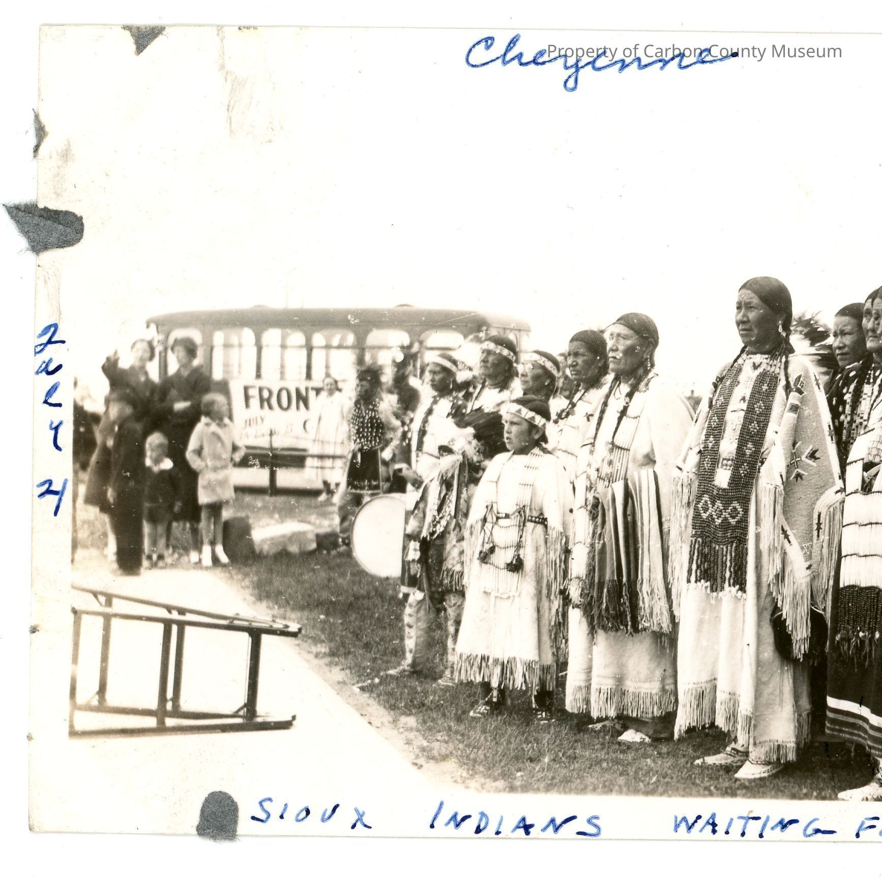 Black and white photograph. A group of Native Americans wearing traditional clothing. Along the top of the photograph is written "Cheyenne", along the bottom "SIOUX INDIANS WAITING FOR SALLY", vertically along the left "JULY 24", vertically along the right "1935". The number 265 is printed on the reverse.Collection