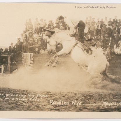 Written on original negative at bottom: "C. Sawyer pleasing his fans riding in "Wild Horse Race" Rawlins Wyo". "Meyers photo 17".
