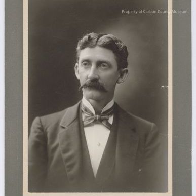 Update - 2009: Black & white print. Studio portrait. Mounted on grey matboard with silver edge. Half-length portrait of a man wearing a dark 3-piece suit, white shirt & patterned bow tie. He has short wavy hair which is parted down the center & sports a large mustache.