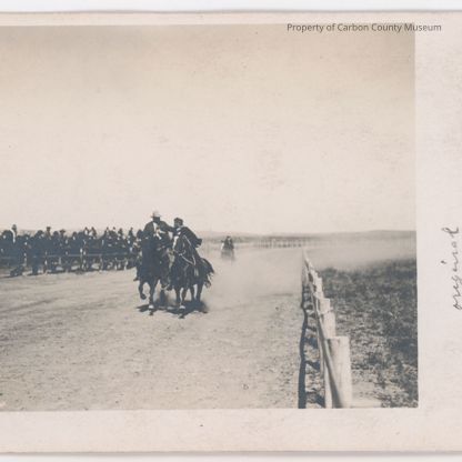 Update 2009: Black and white print. Printed on postcard paper. Image of two men on horseback galloping down a race track toward the camera. Inner rail on right. Spectators on grandstand in left background. Another horseman on track in background.