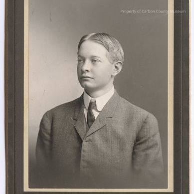 Cabinet card . Portrait of a young man with light hair and center part. Light eyes, suit jacket, white shirt with stiff collar and black narrow tie. print is affixed to light black matboard . At bottom edge of mat on left is engraved with "The Stevens Studio" in tiny white script and on right in even smaller script is engraved "McVicker Theater Bldg, Chicago" .