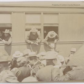 Update 3/2010: Sepia print. Snapshot. Mounted on tan matboard. 1951.162.0342 mounted on back . Image of a group of people gathered on a train platform below the open windows of a passenger car. a uniformed soldier is leaning out of each of the three windows. Feathery anomaly in lower right.
