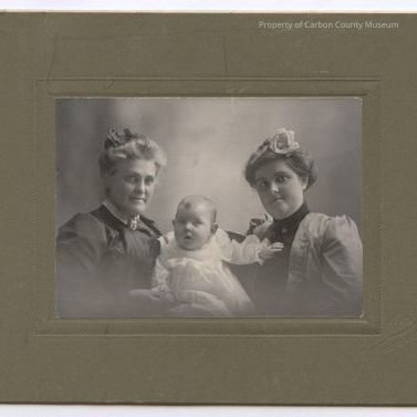 Black and white studio portrait print affixed to grey matboard of an older woman on left with gray hair in an updo wearing a dark dress with puffed sleeves and white collar holding a baby dressed in white ruffled dress. A younger women is seen photo right next to baby. She has her dark hair in updo with cloth white flower in her hair at side left front. She is wearing a puffed sleeve bolero type jacket with a high neck dark blouse underneath. She has dark eyes.
