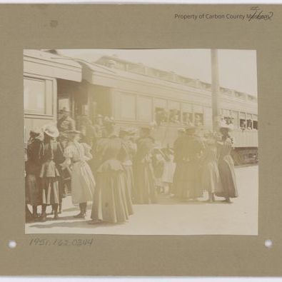 Update 3/2010: Sepia print. Snapshot. Mounted on tan matboard with two binding holes in lower edge. Mounted on back of 1951.162.0345. Image of a group of women and children on a train platform in front of a train of passenger cars. Soldiers are hanging out of the open windows and standing on the front and rear platforms of the cars.