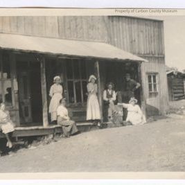 Black and white snapshot of three men, four women and a young girl standing and sitting on front porch of a large rustic wooden cabin type structure with small log out building seen side right. On far left of porch a man dressed in pants, jacket, white shirt, light thigh crown hat is seated next to a young girl dressed in white dress with dark hose. Other women are dressed in long dresses of skirts and all are wearing hats of different types. A man is standing side right with his right leg propped on a box(?) on which another man is seated. Man standing is wearing pants, vest, white shirt and hat tilted back on his head. There is a porch roof supported by four 2 x 4s, one on each corner and others uniformly spaced supporting roof. There are six pane long windows on either side of front door and a small six pane long window on cabins far right. Photo is slightly blurry and features of people are not clear. Barren ground is seen in foreground with hill and trees in distant far right.